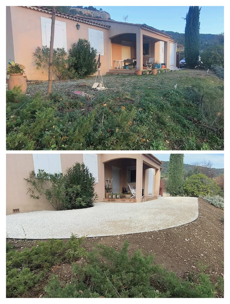 Zoomer 17-04-2025 Nous avons été appelé pour l'aménagement du pourtour de cette habitation par la mise en place de gravier à APT. Ce choix d'aménagement donne un aspect plus élégant au jardin et permet d'y circuler confortablement.