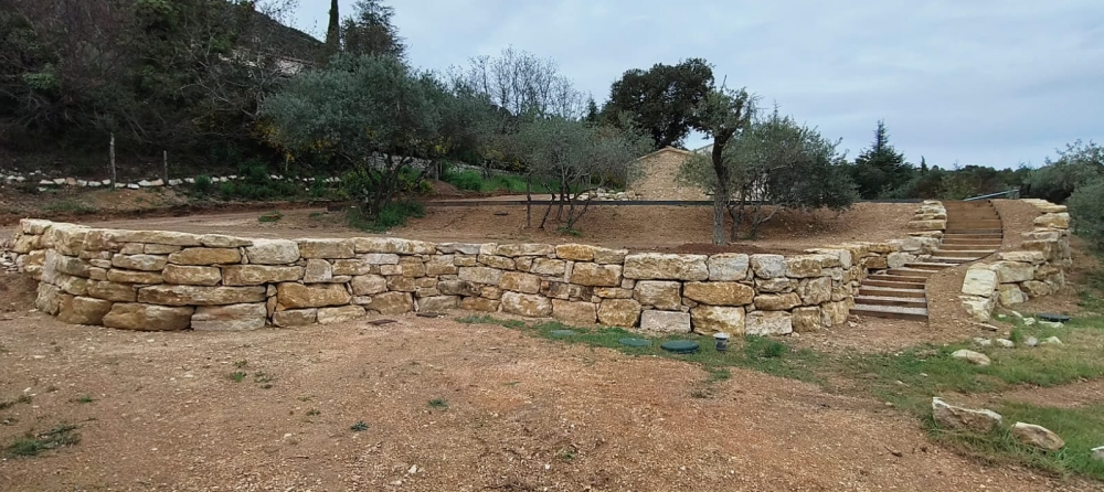 Zoomer 16-07-2025 Nous vous présentons ici la création d'un enrochement paysager de soutènement et chemin d'accès avec marches en bois.