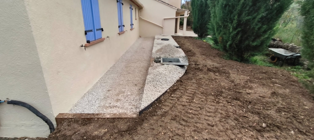Nous sommes intervenus à l'arrière de cette maison pour réaménager le réseau d'infiltration d'eau pluviale par les gouttières et travaux de drainage autour de la maison.