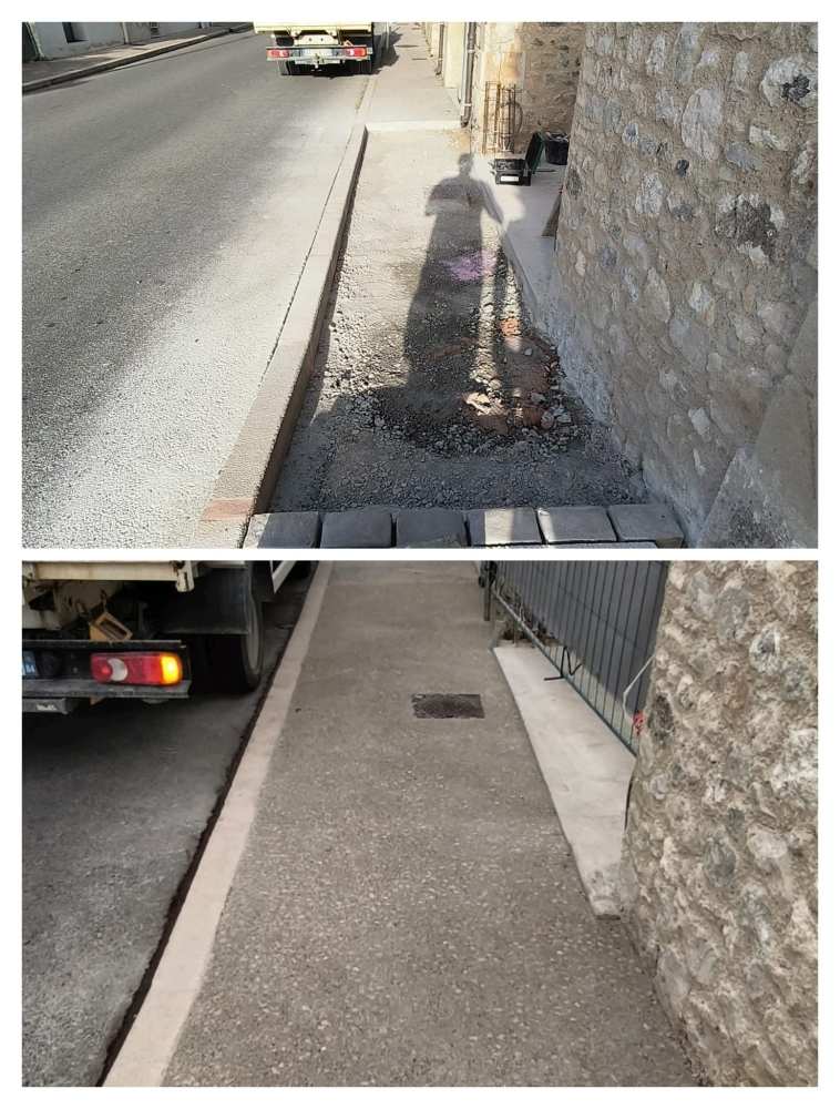 Ici nous avons refait complétement une partie de l'accès trottoir, notre travail a tenu compte de l'existant et le résultat final se mari parfaitement avec la partie du trottoir déjà existante.